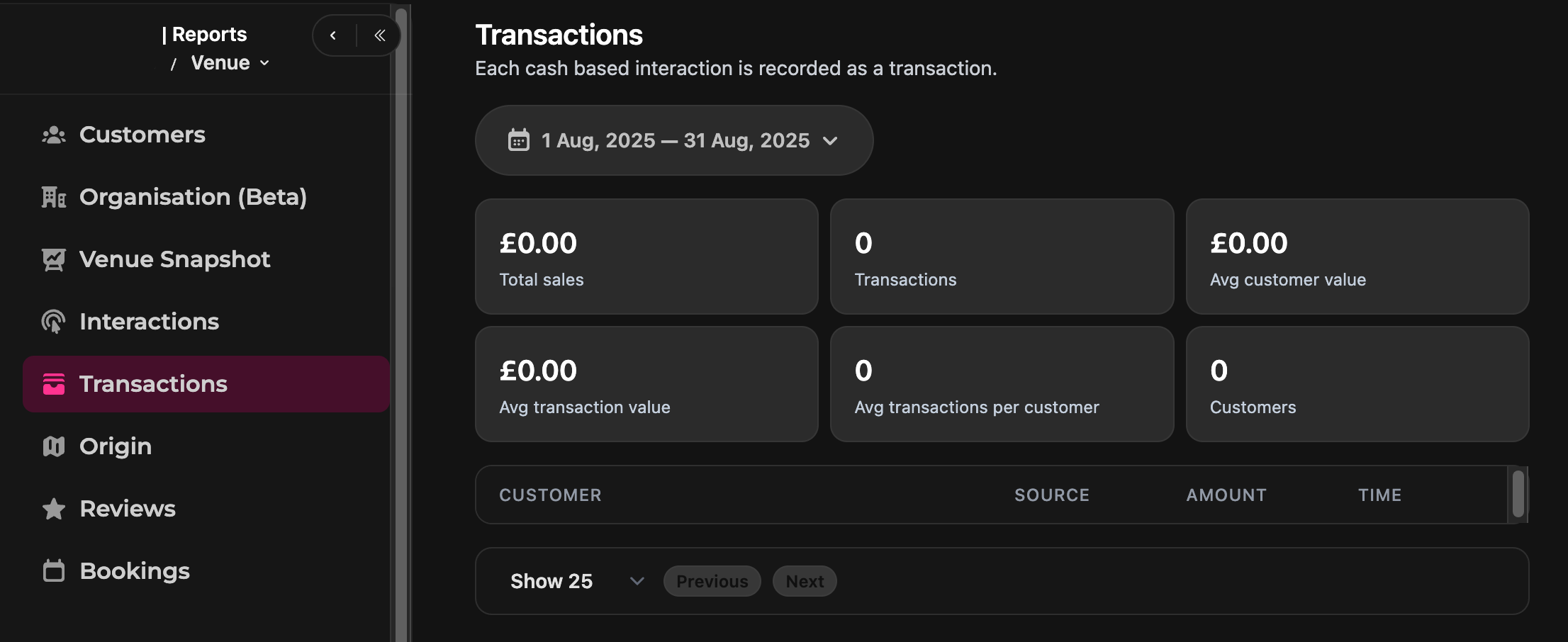 - On this page you'll find detailed transactional data for all cash based interactions originating from a Stampede product at your venue. You can filter by time frame and view the customers' individual actions in a log at the bottom.