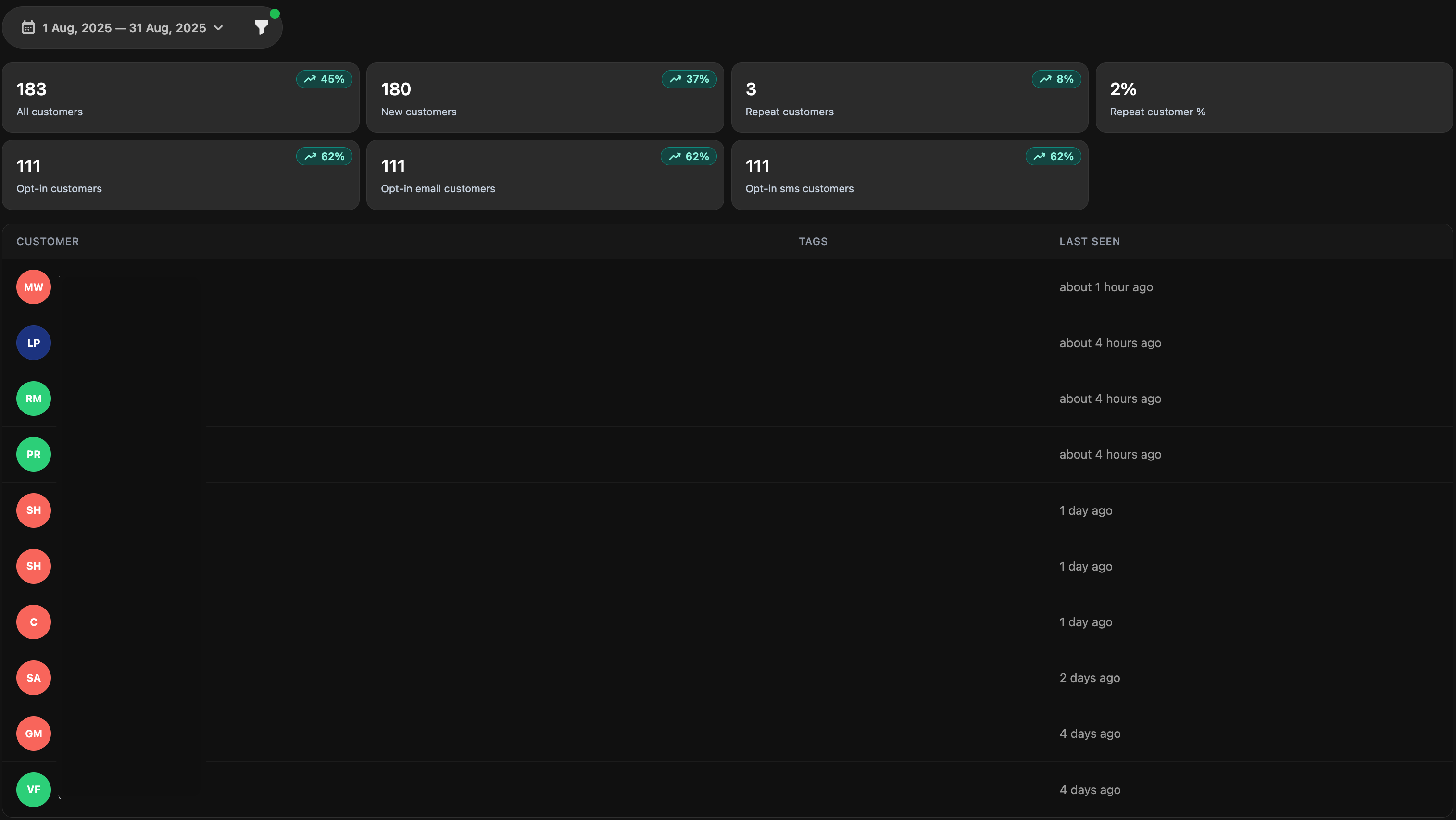 This article will guide you on how to access and interact with customer information, including your total number of customers, how many are new or returning, and whether customers have opted into email and SMS marketing, among other details.