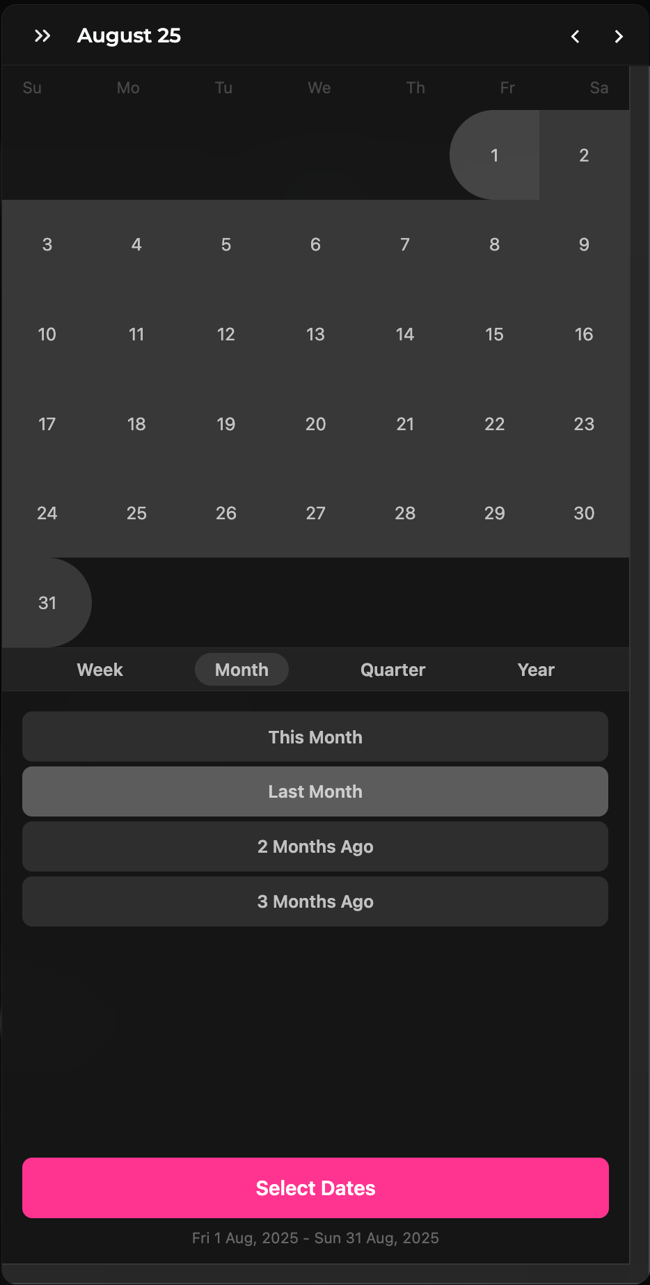 The date range widget is quite flexible, allowing you to select specific weeks, years, quarters, or a range between two specific dates.