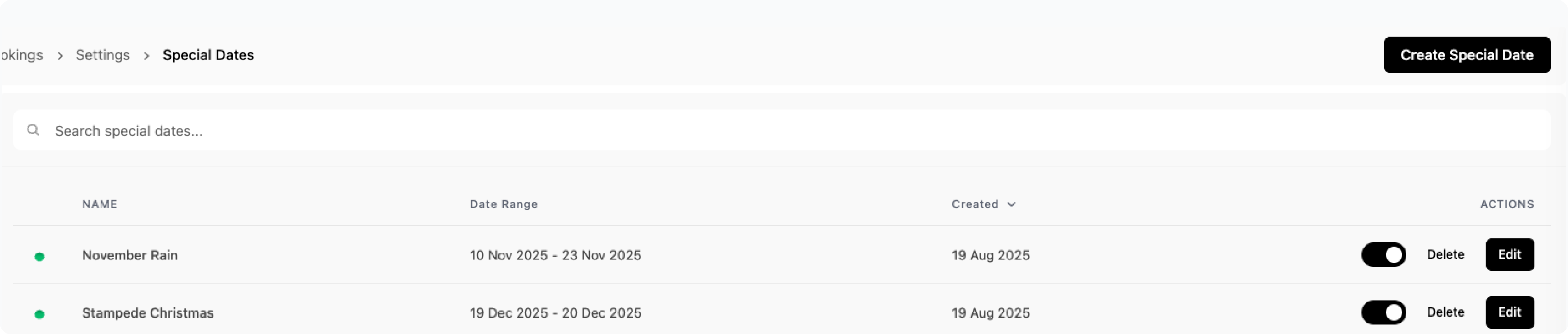 You will now see a list of your existing Special Dates (if you’ve added any before). From here, you can: