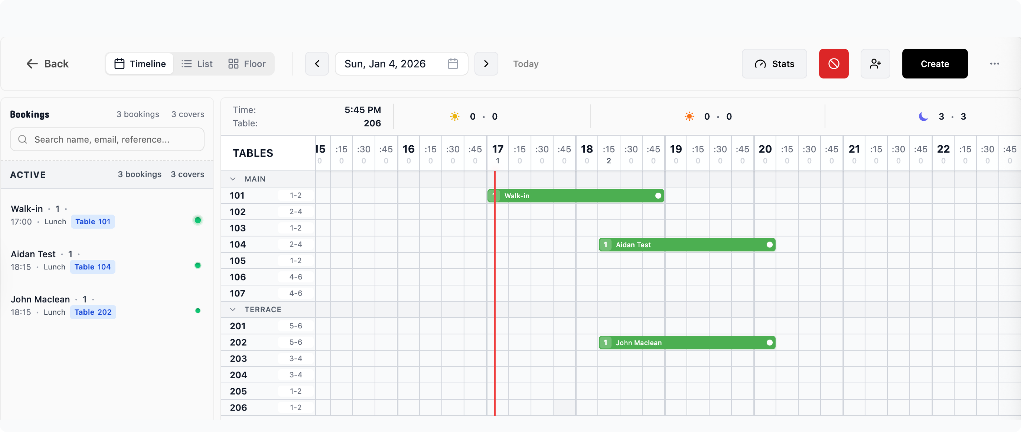- Booking Status: Shows active, seated and completed bookings on the left-hand menu.