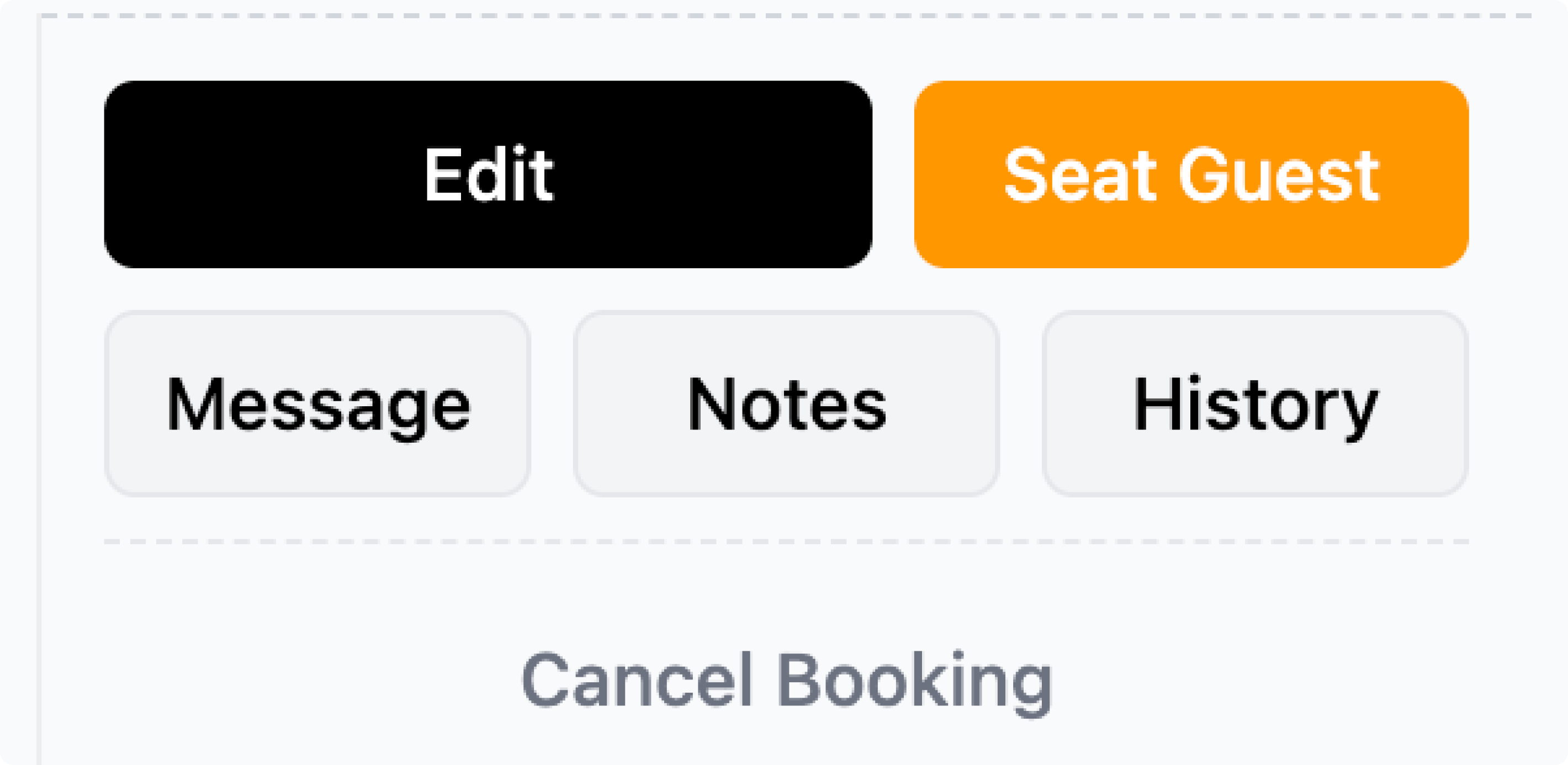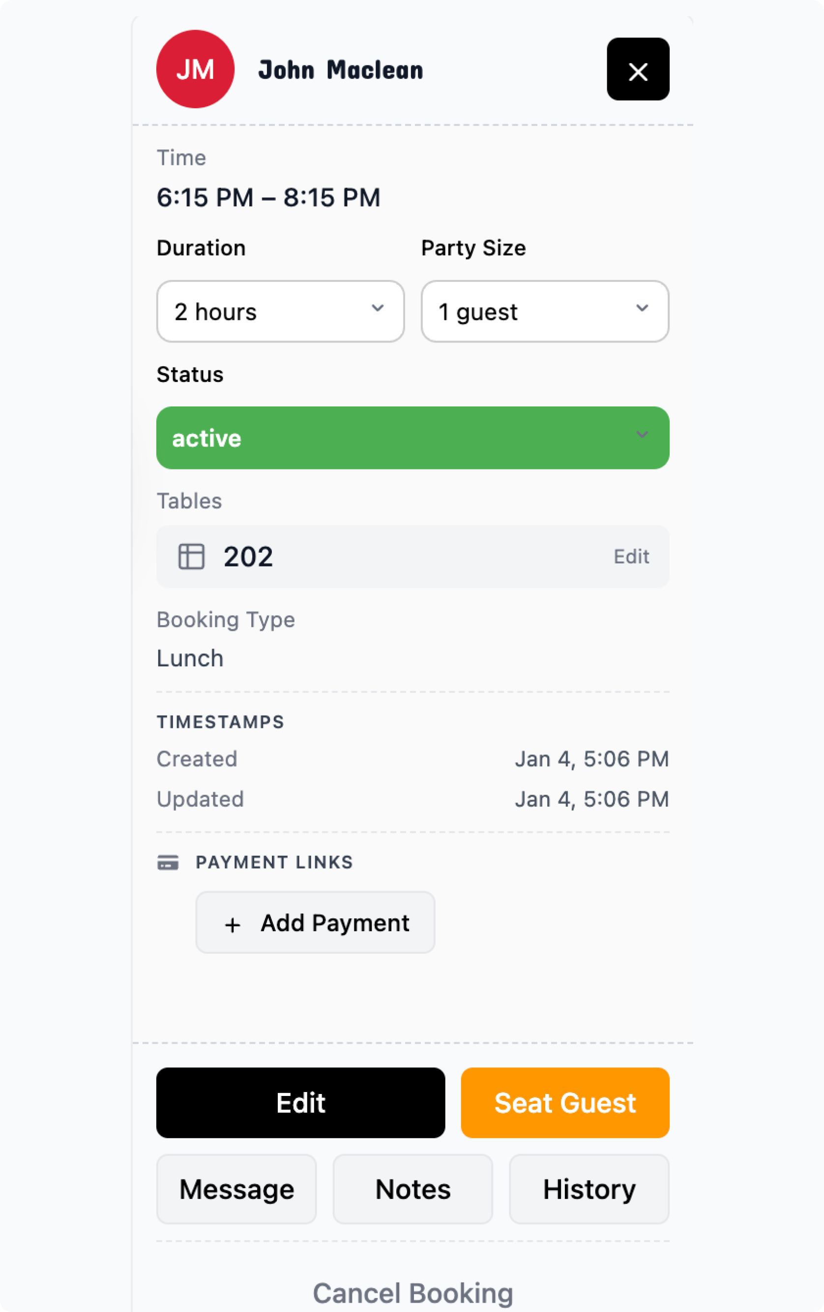 - Change booking status (e.g. active, seated, check dropped, paid)