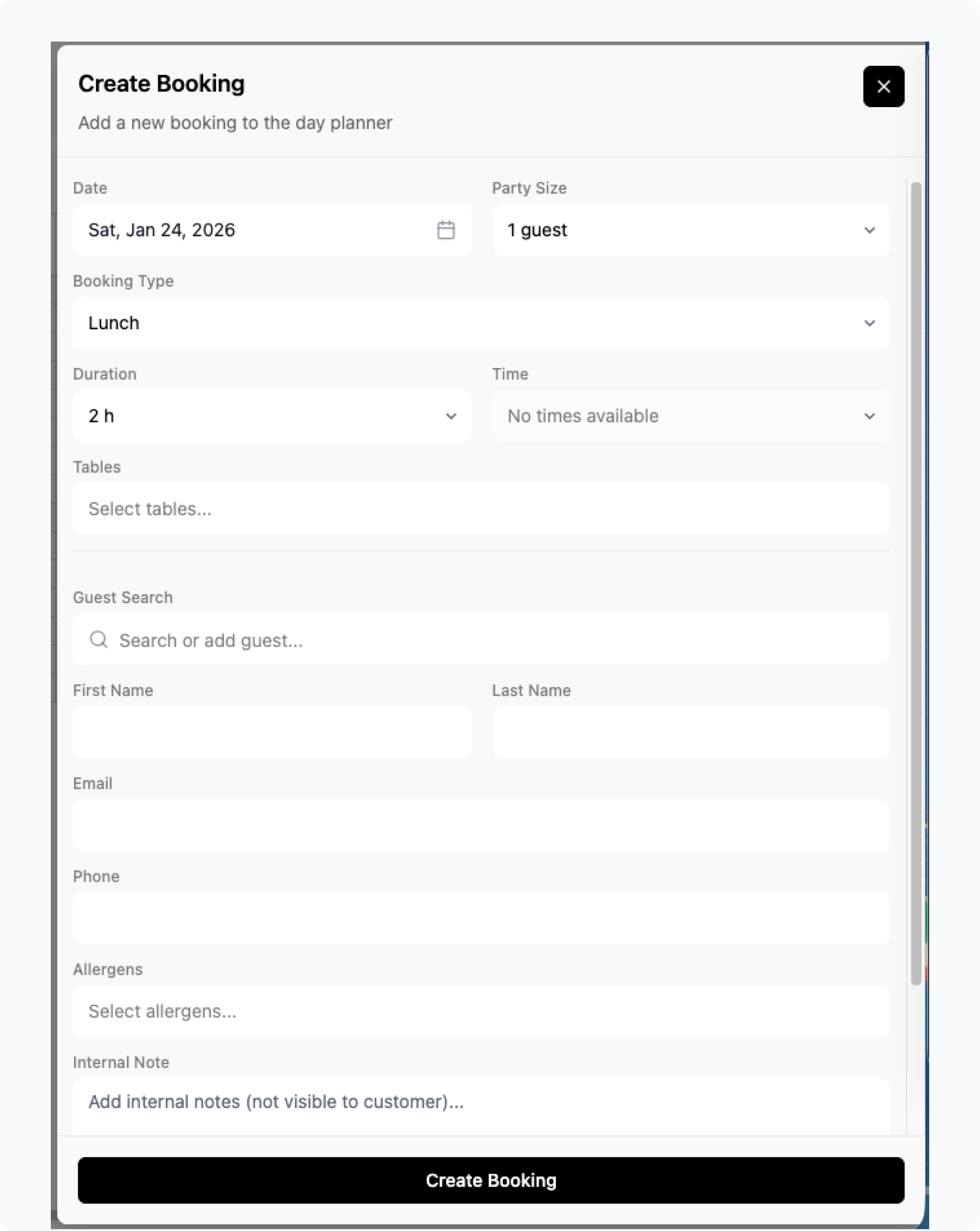Add the guest’s first name and last name. Email and phone are optional, but helpful if you'd like to send confirmations. You can also set allergens and an internal note - Internal Note