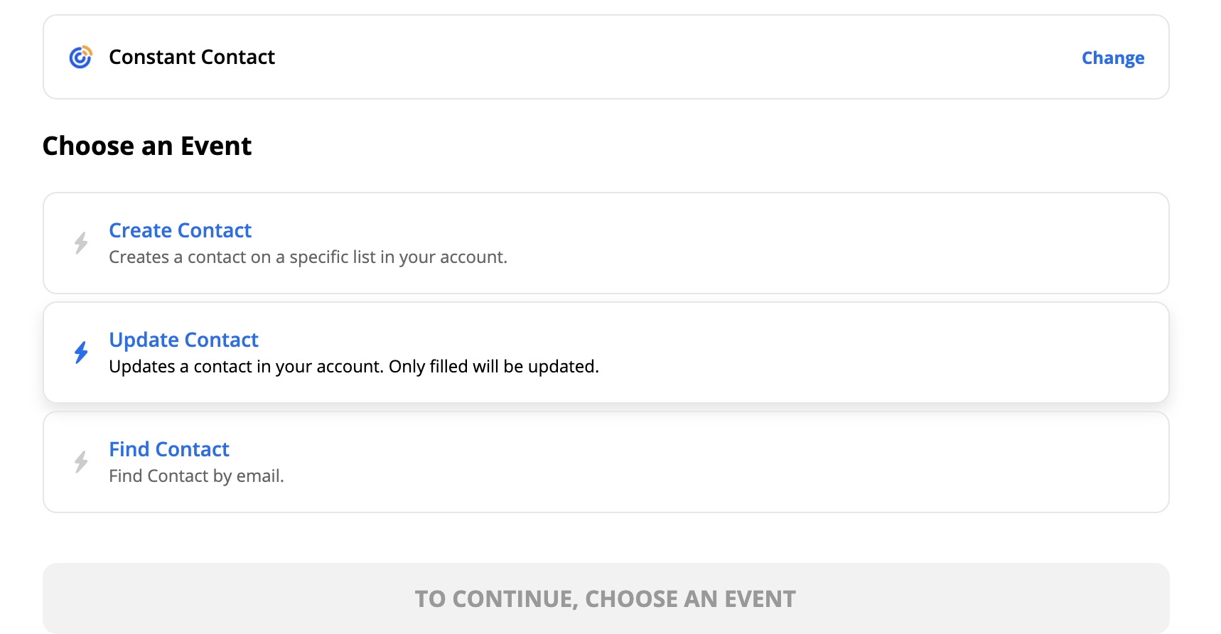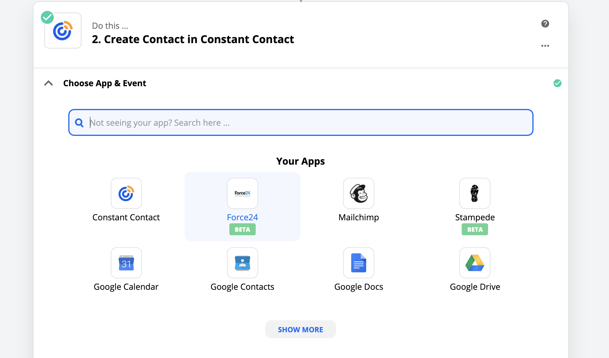 8. Choose the App you want to fire the data to: Now, choose the app you want to push to (over 750 available!) in the search bar. The example here is Constant Contact.