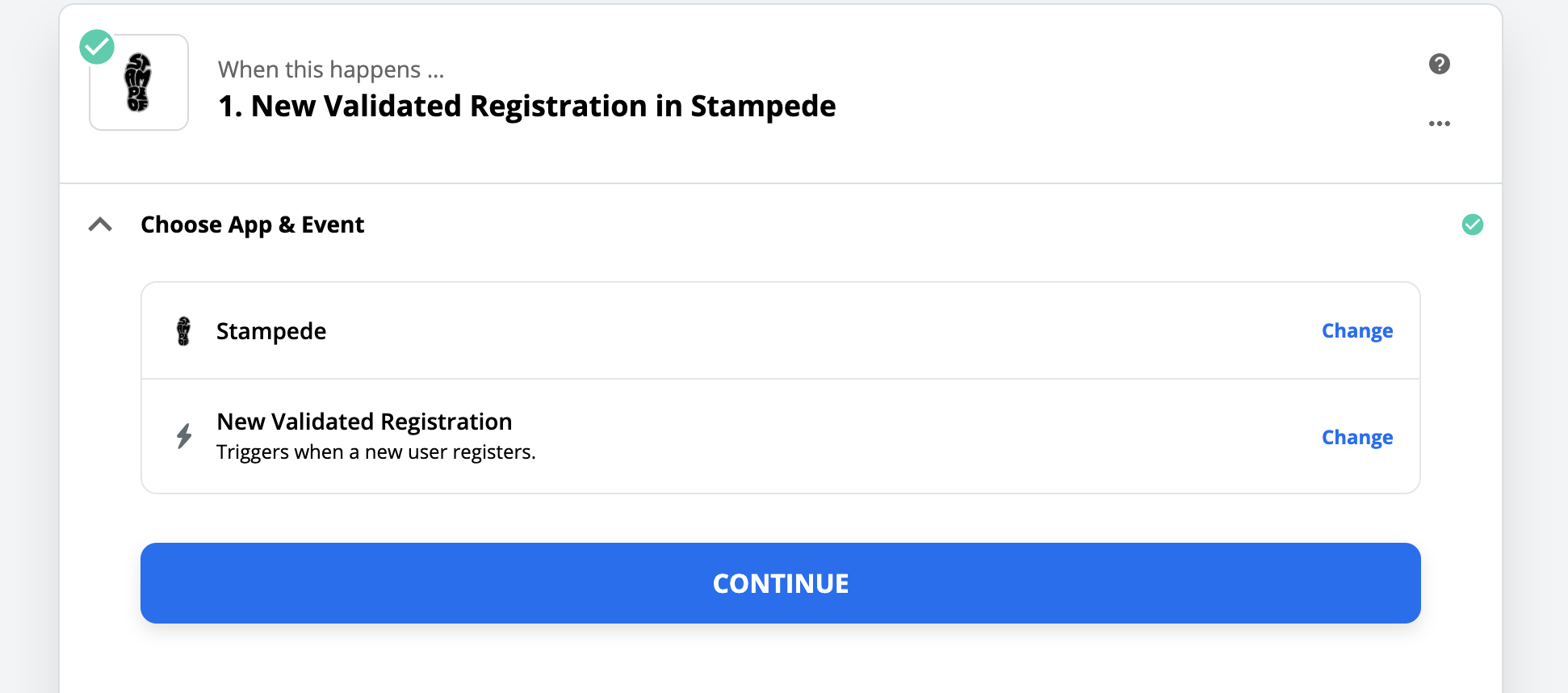 3. Choose what event you want to cause the trigger and select "Continue". In this step you will also choose Stampede as a the first app.