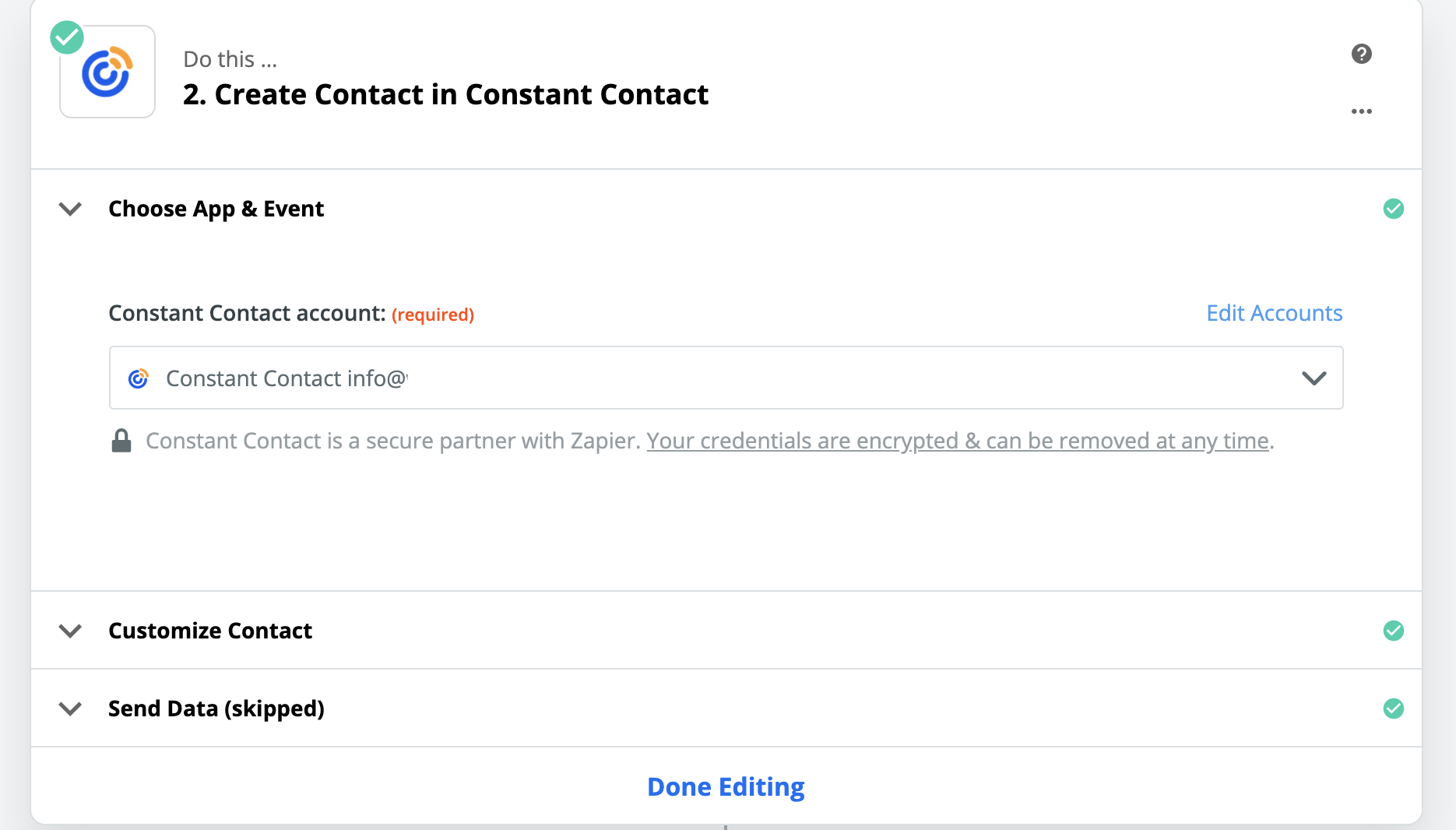 10. Now you have to connect the action account (Constant Contact in this example). Click the "Connect/Edit an Account" button.