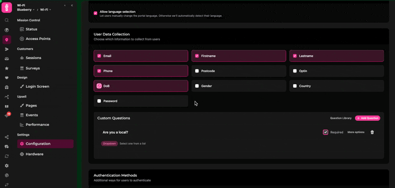 In this article, you’ll learn how to customise the data capture fields on your Stampede captive portal to match your marketing goals. We’ll guide you through configuring both pre- and post-authentication options, adding custom questions, and selecting valuable data points like email, phone number, and date of birth. These settings allow you to personalise the Wi-Fi sign-up experience, collect meaningful customer insights, and power automated campaigns. Whether you just need basic contact details or want to capture niche preferences (like favourite drinks), Stampede gives you the flexibility to create a sign-up journey that works for your venue.