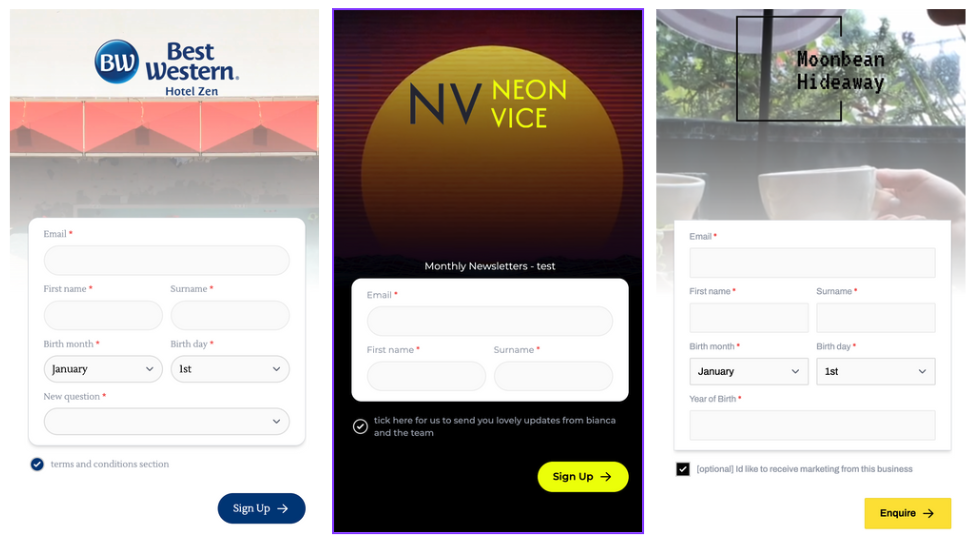 Use custom fields to capture extra details like “Favourite Drink” or “Are you local?”.