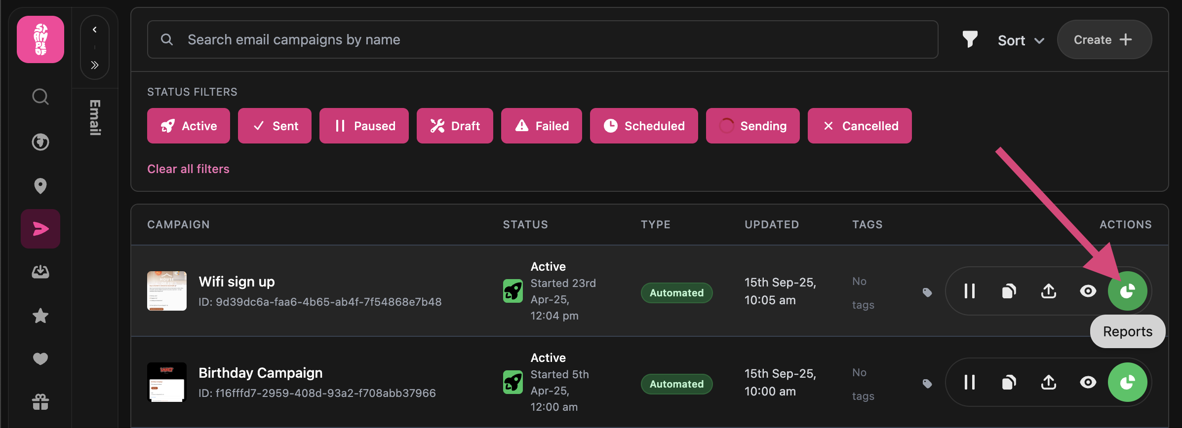 The campaign report is located next to each campaign. Simply head to Marketing > Emails and click the report icon next to the campaign.