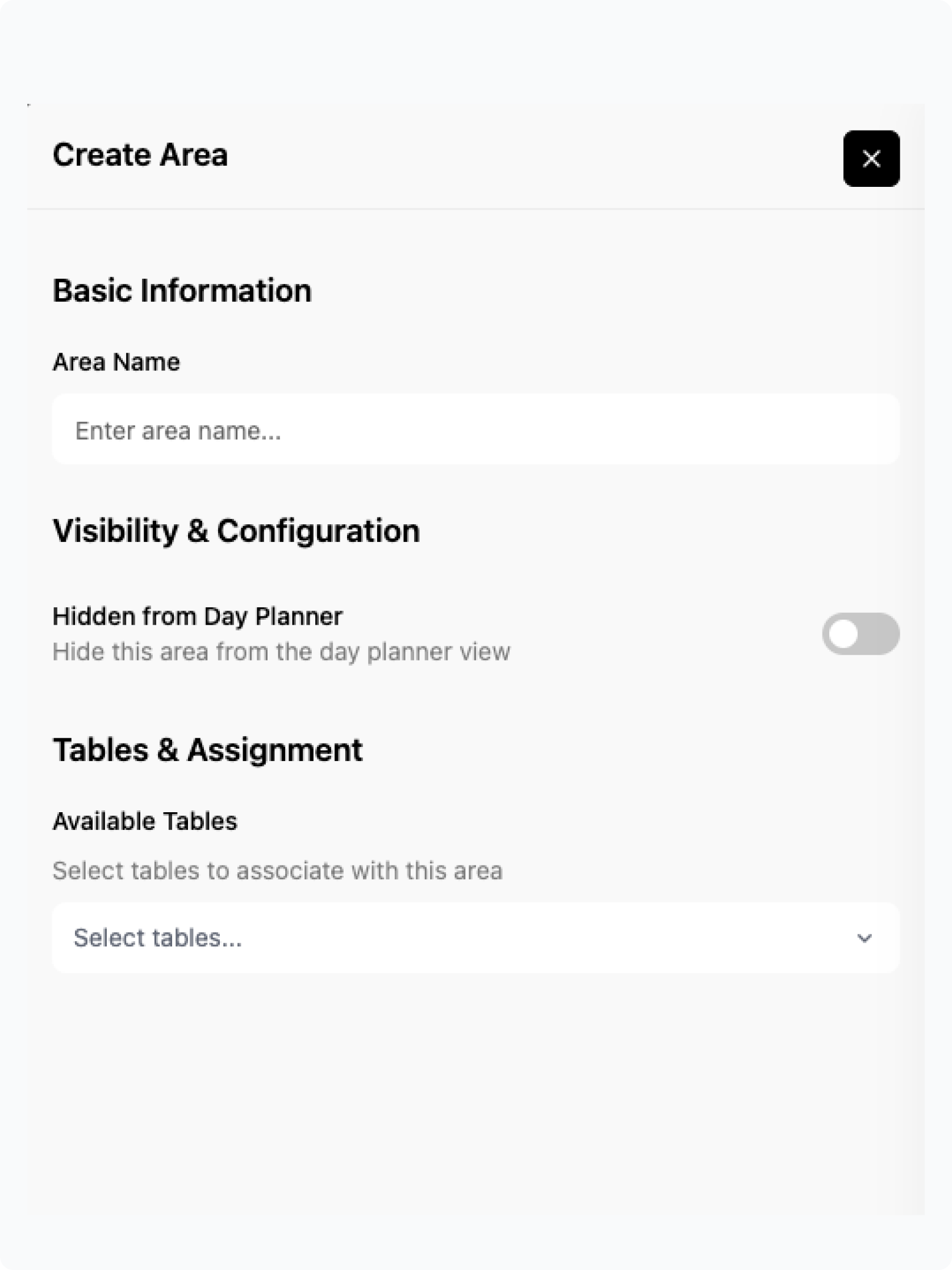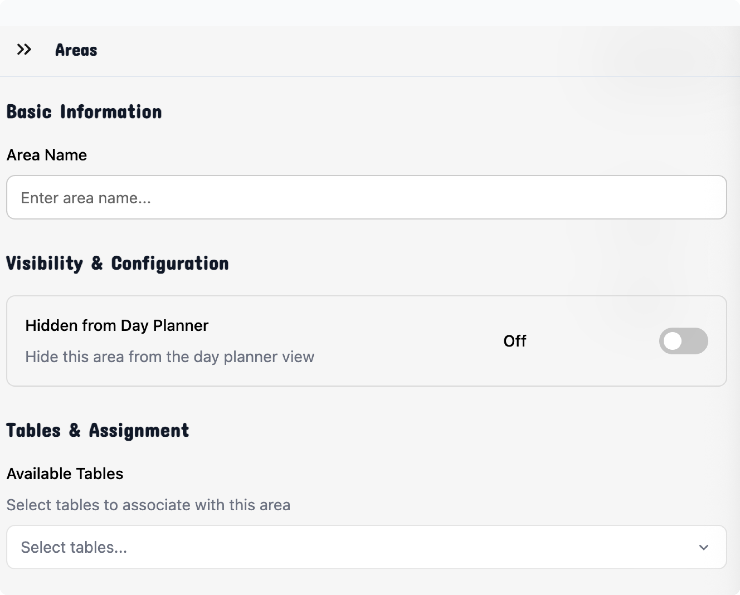 - Tables & Assignment: Select the tables for this area from your existing table list