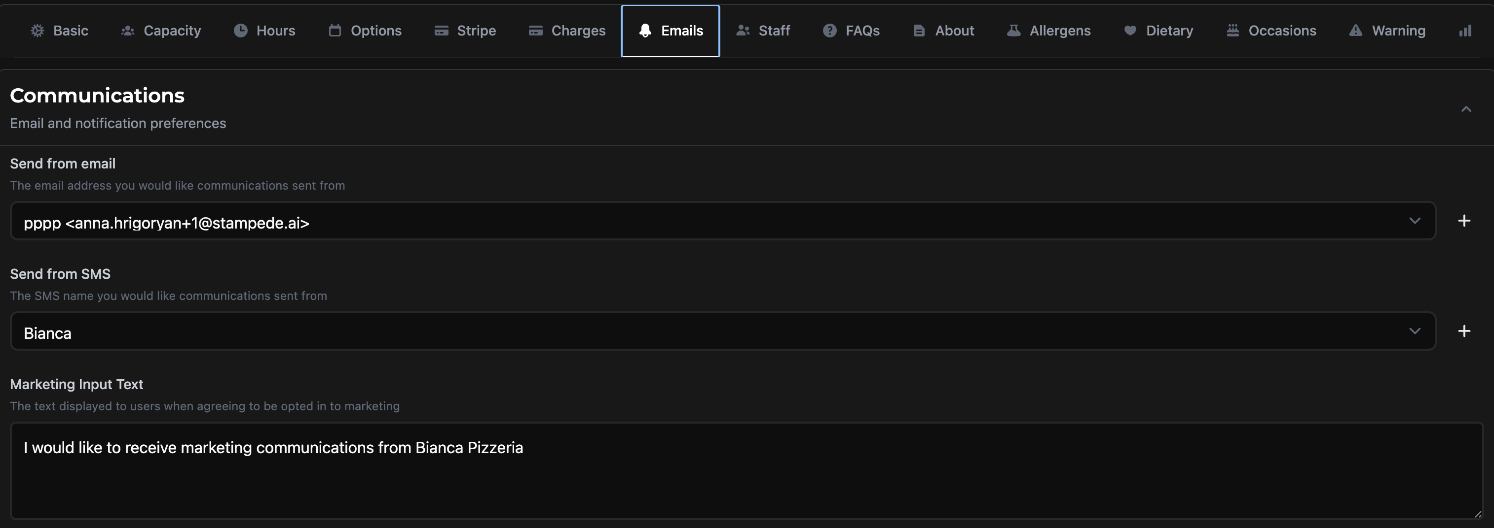This section allows you to control how your venue communicates with guests setting custom sender details, messages for large group enquiries, and your marketing opt-in wording.