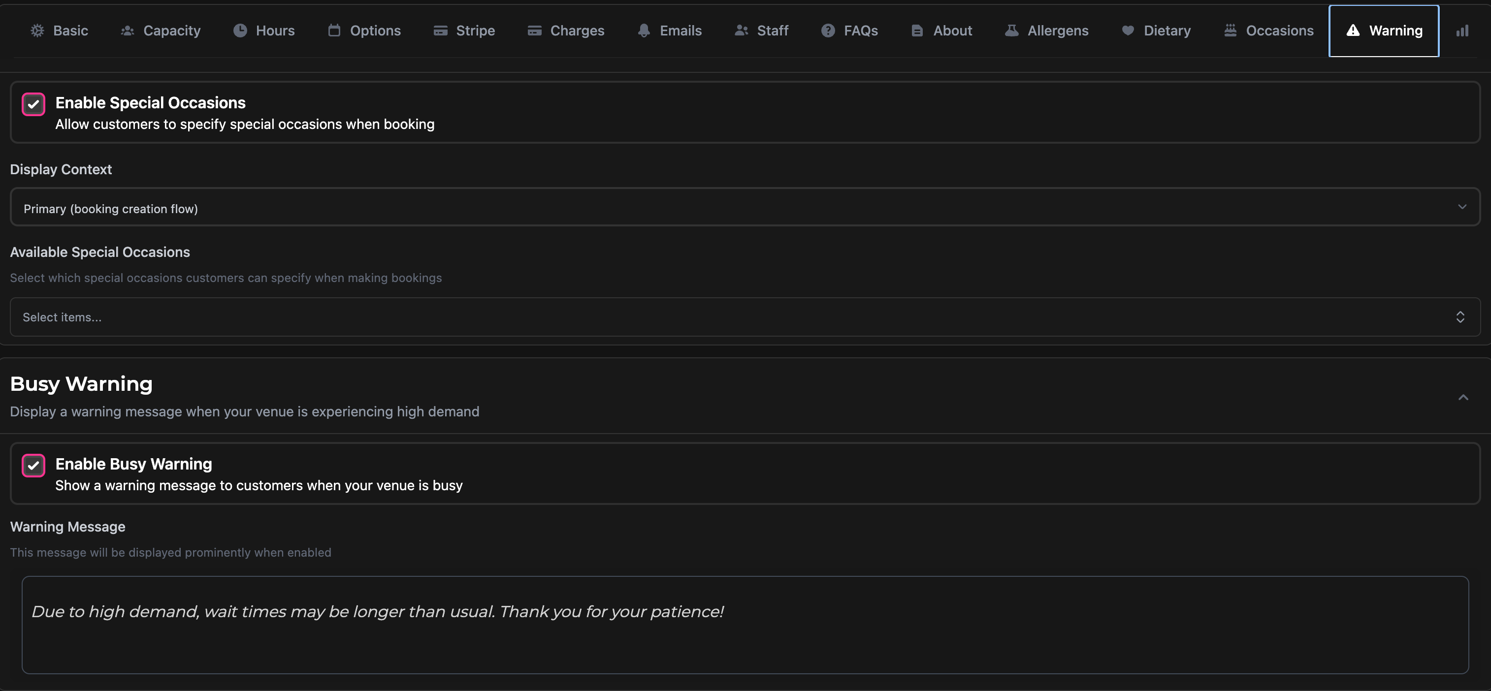 If a guest tries to book when there's a high volume of covers, you can enable and edit a warning message that will let customers know that there may be a delay in service due.