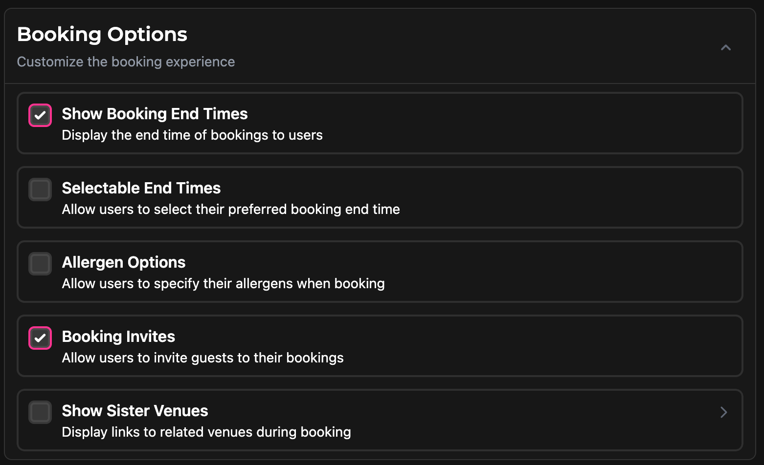 The Options section gives you control over what your customers see and how they interact with your booking system. From allowing same-day bookings to showing end times and linking sister venues, these settings help you tailor the experience to your business needs.