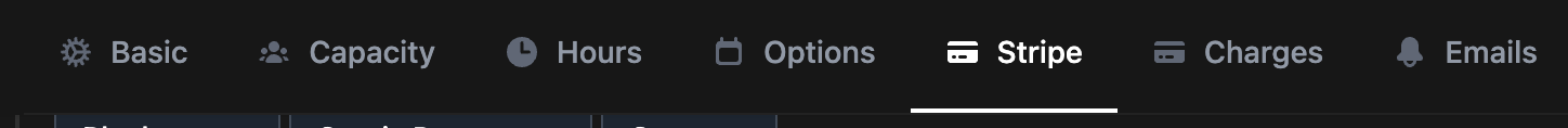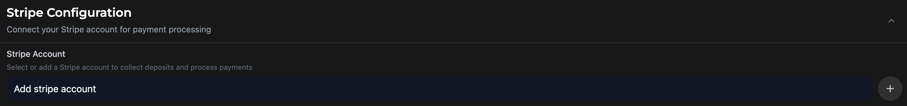 Scroll to the bottom of the bookings page and click on Configuration. In the main configuration menu, select Stripe to connect your venue’s Stripe account. Without this connection, you won’t be able to activate cancellation or deposit charges.