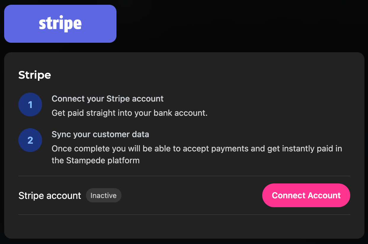 Important: Before you can take any payments, you must first connect a Stripe account.