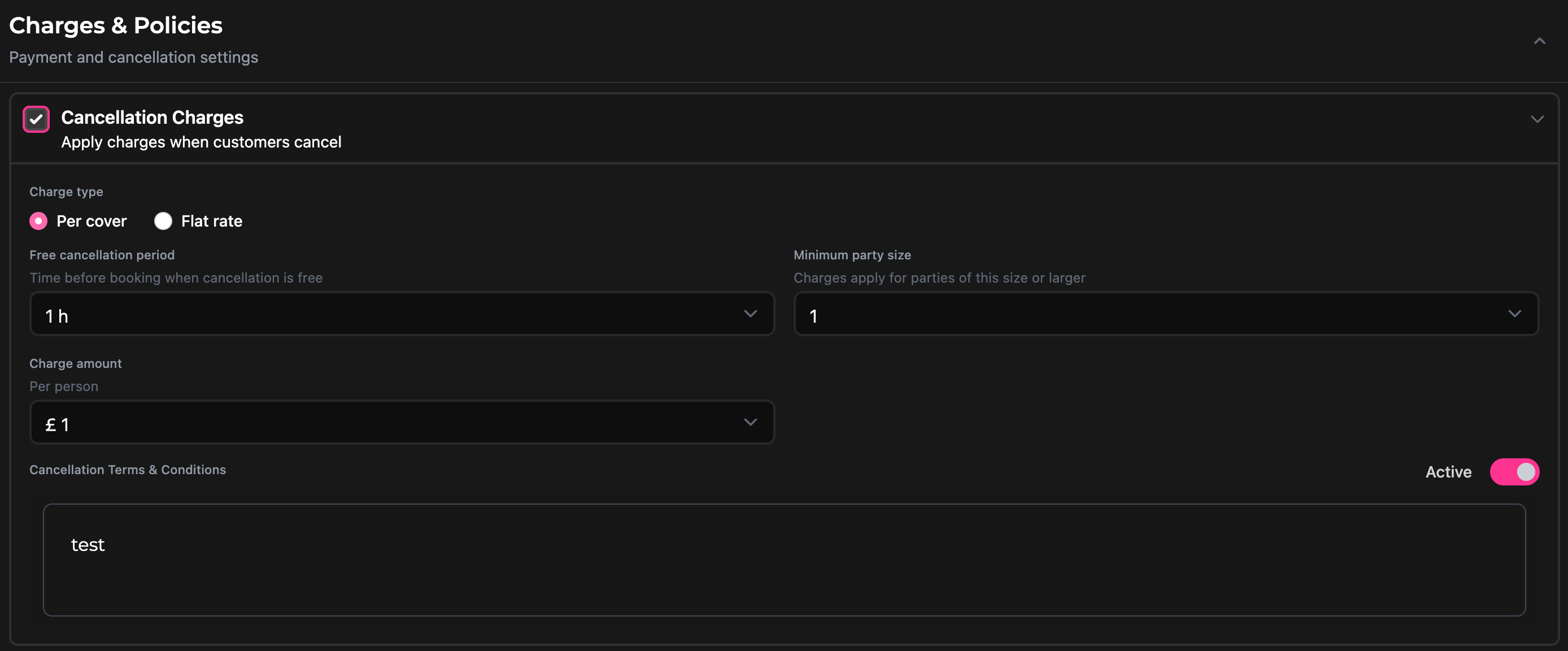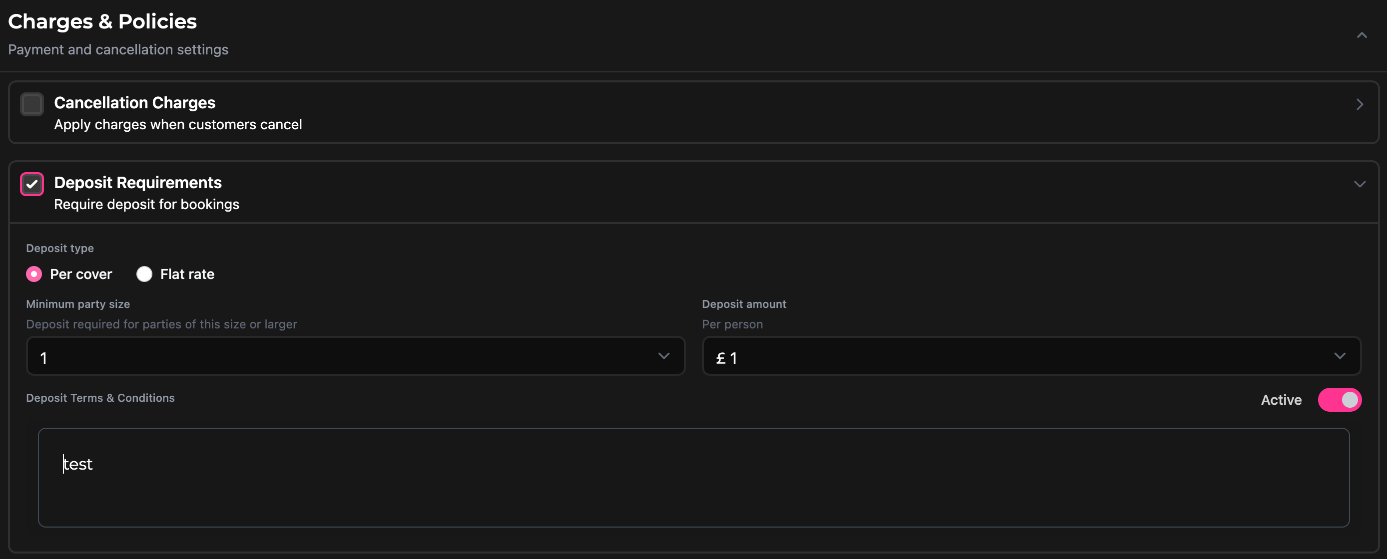 You can configure deposits and cancellation fees for your bookings, helping protect your business against no-shows and last-minute changes. This section includes options for flat fees or per-cover charges, and lets you set minimum party size limits for when these rules apply.