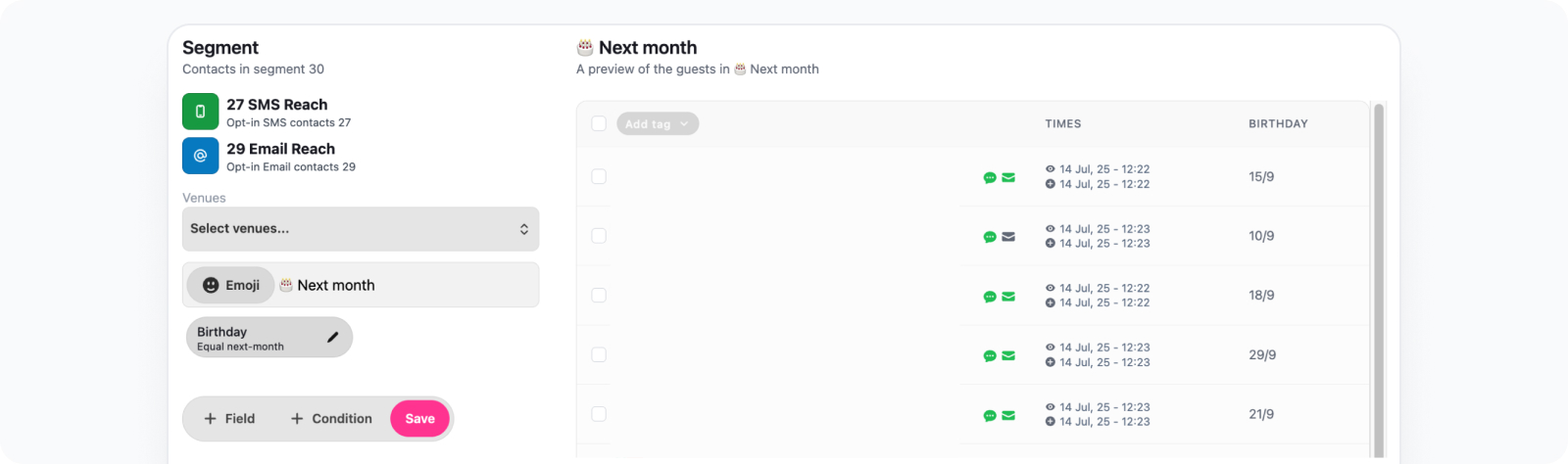 Segment – Create or select the Birthdays Next Month segment to target only guests with upcoming birthdays.