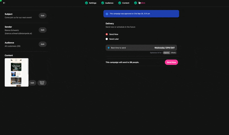 In this article, You’ll learn how to send an email campaign in Stampede from choosing a template to scheduling and sending your first newsletter. This guide is perfect for monthly newsletters, seasonal promotions, or one-off event invites.
