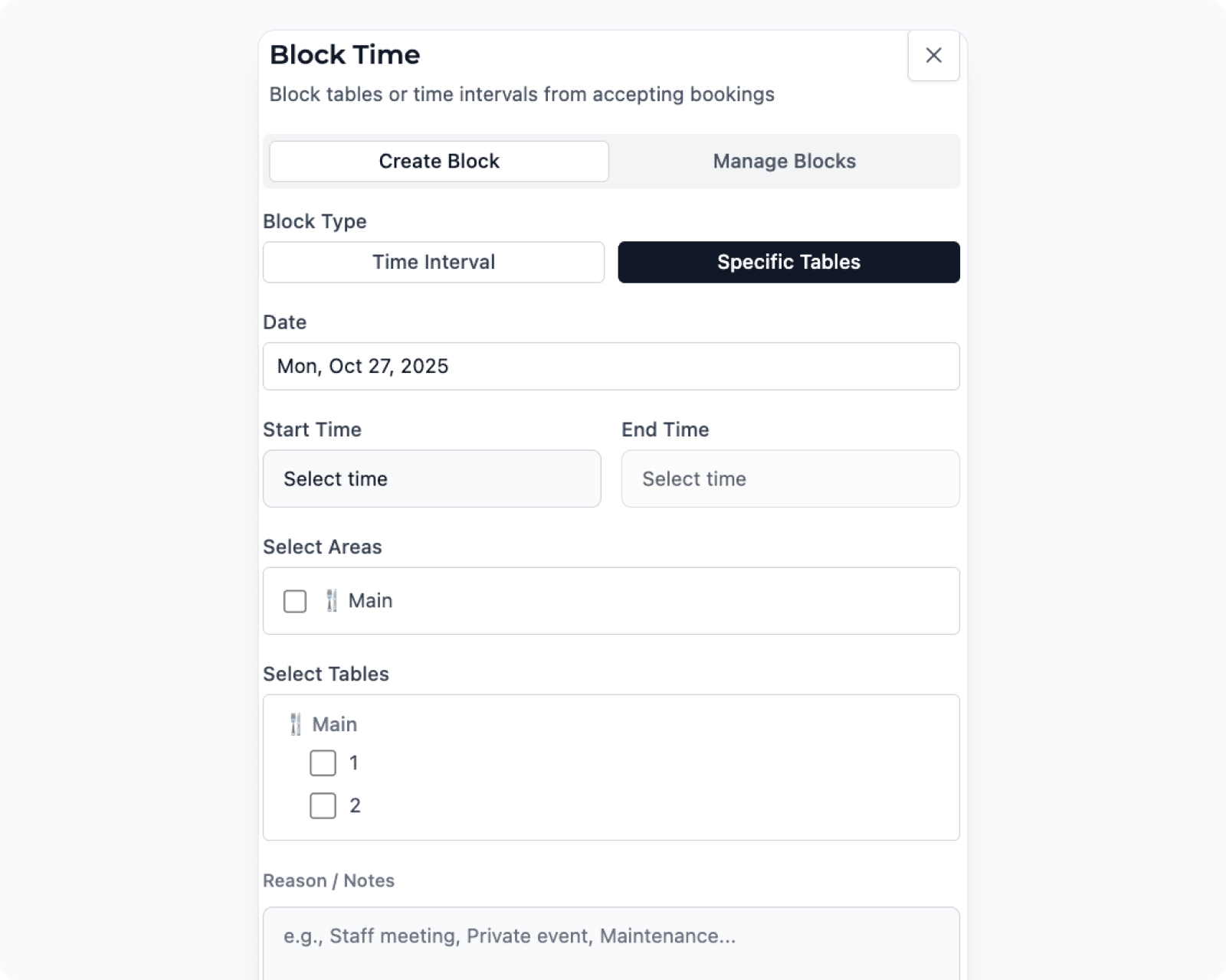 Select the tables or areas you want to block (for example, “Terrace” or “Private Dining Room”).