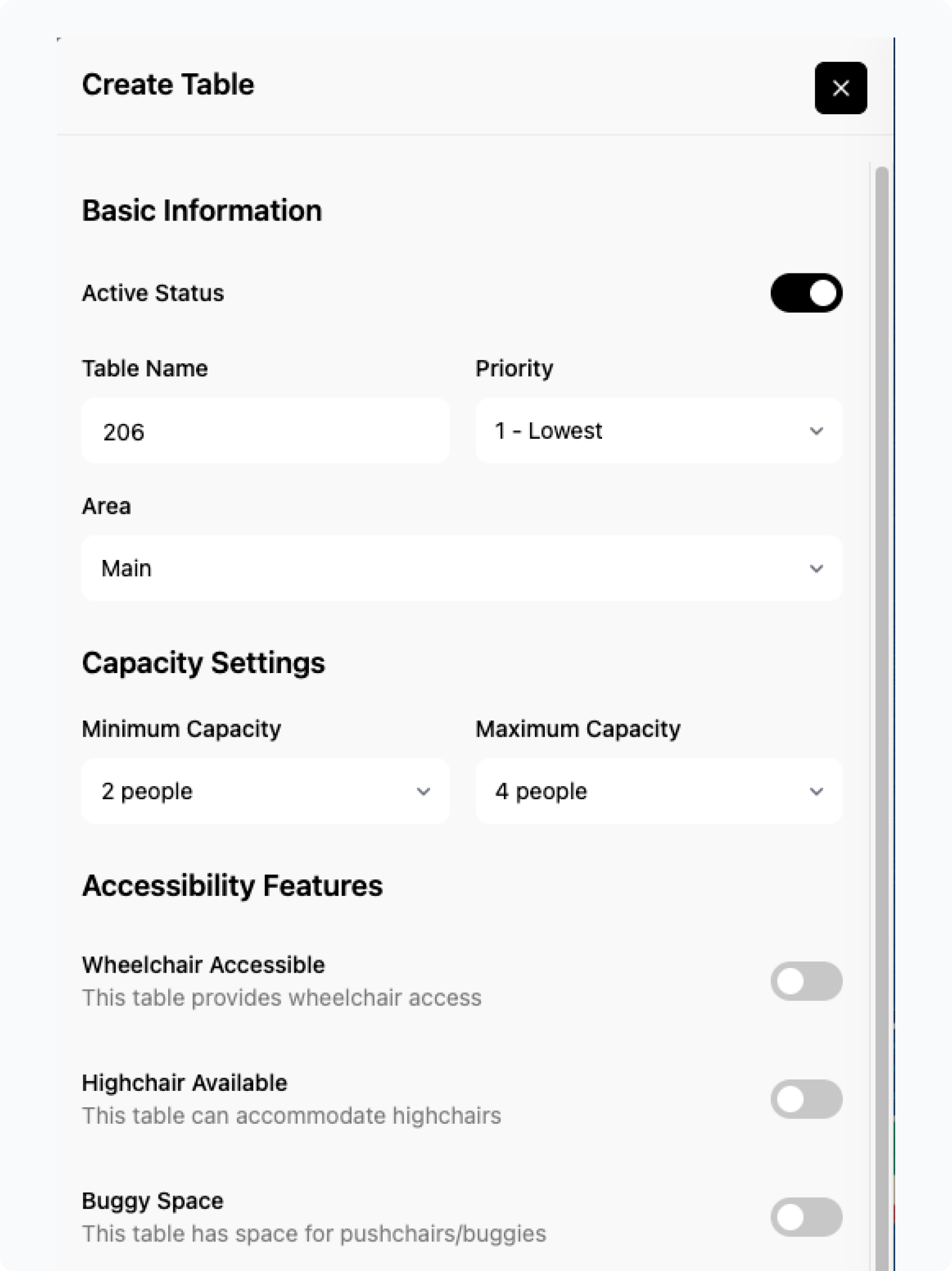 - Table capacity: Minimum + Maximum number of customers that can be seated at a table.
