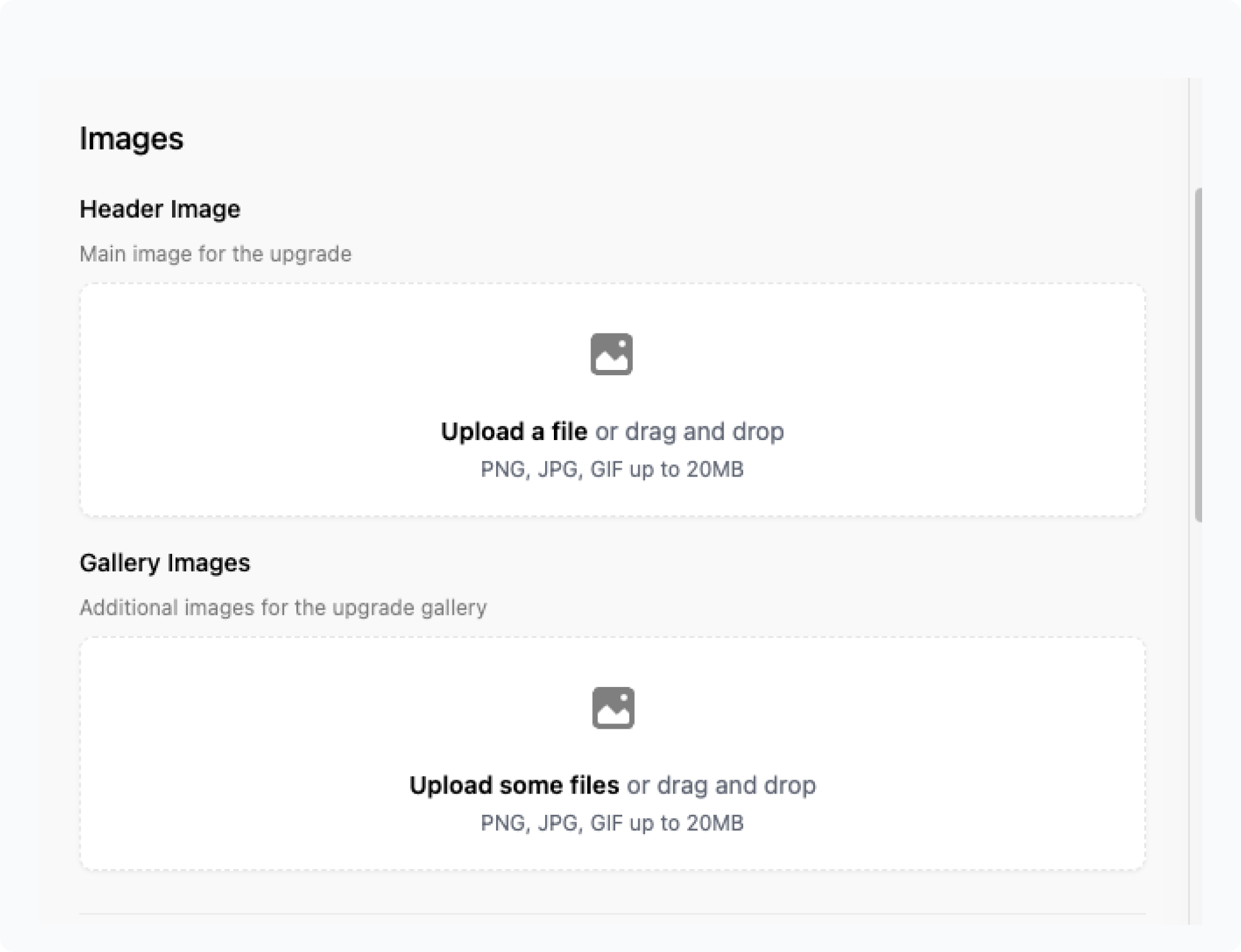 - Header and Gallery Images: Add images for the upgrade that advertise the product.