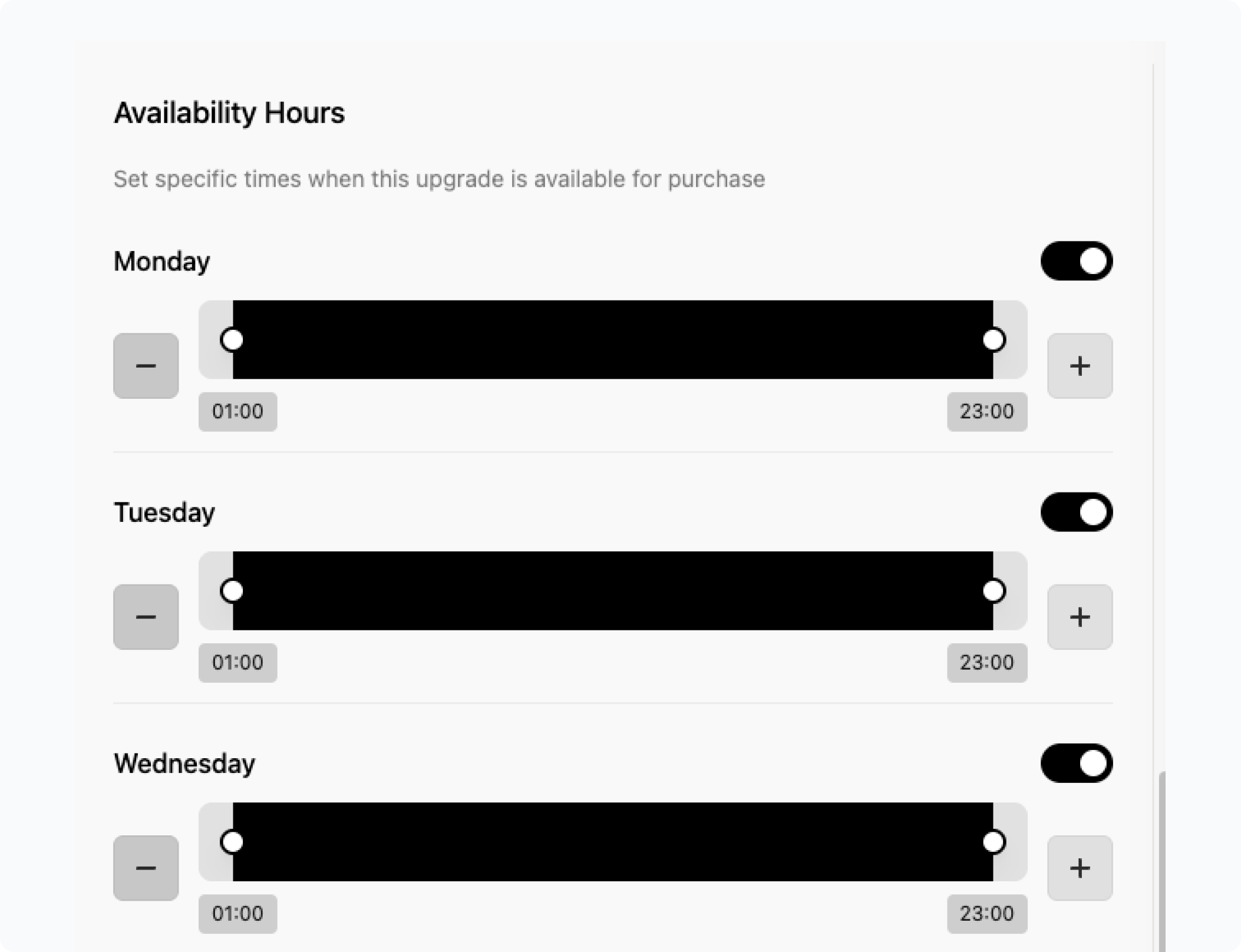 Setting the time that the upgrade is available means that your upgrade options won't show up just for any type of day. For example, if your upgrade is dinner-specific, then this won't be available for breakfast or lunch bookings.