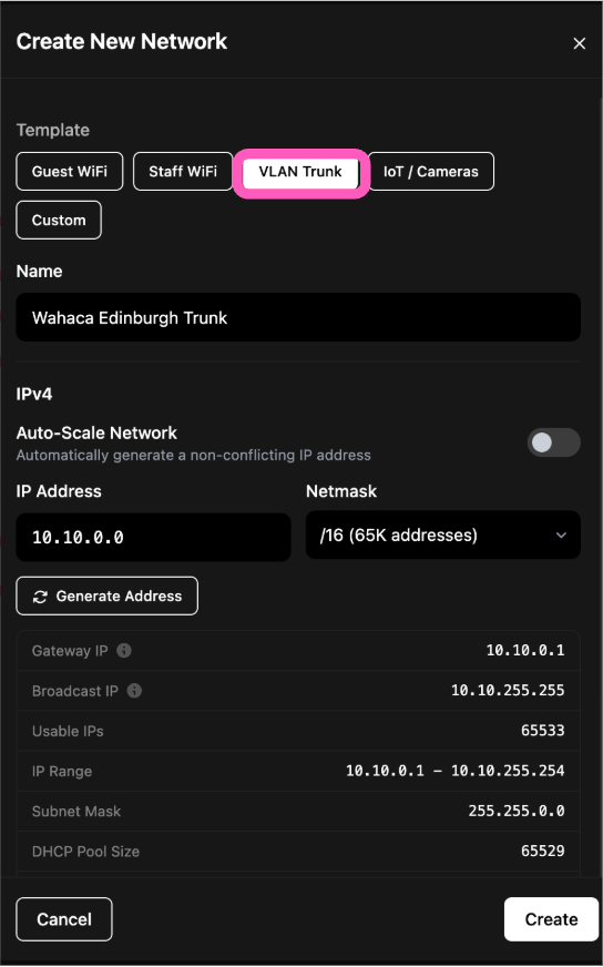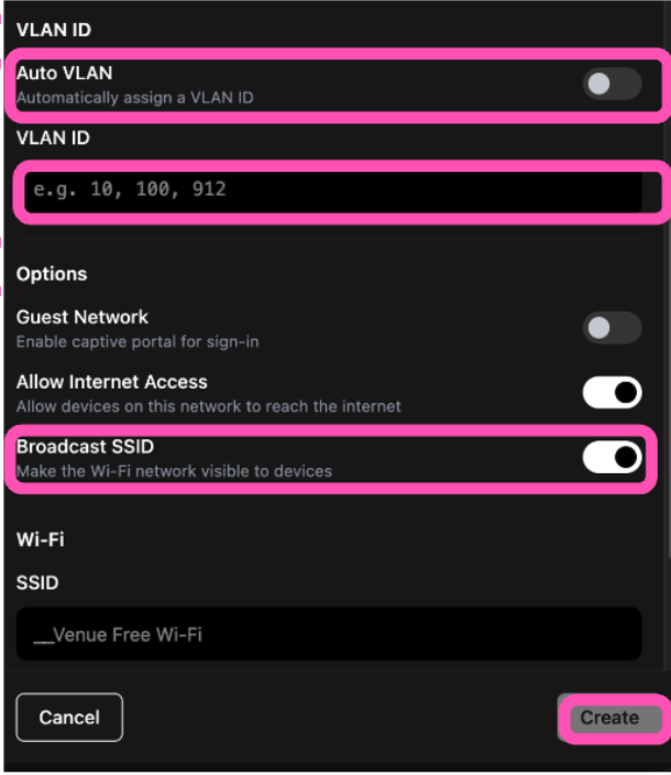 2. Choose VLAN Trunk > Untick Auto VLAN and please enter the VLAN appropriate for your network (Please make sure DHCP is turned off as the SNAPguard will be doing this) > Untick Broadcast SSID as your network will already be doing this > Create