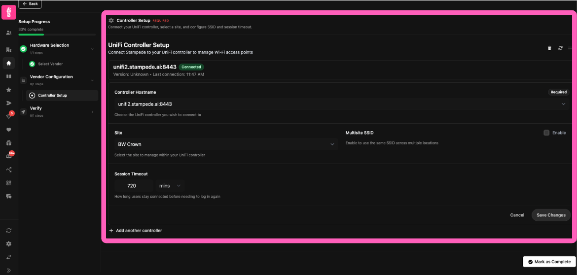 If you have chosen a controller, a successful connection will show "Connected" (This example is for a UniFi Controller).