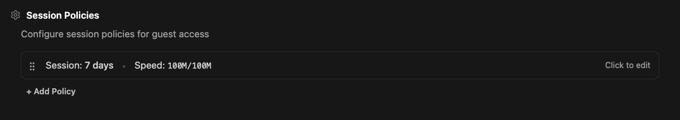 Add Policy allows you to create multiple policies — for example a shorter session with lower speeds for a free tier, and a longer session with higher speeds for a paid or loyalty tier.