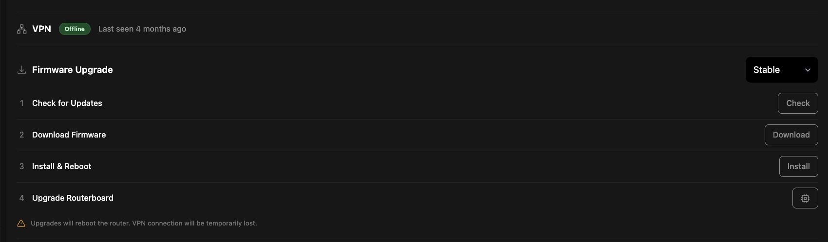 MikroTik routers have two layers of firmware: the RouterOS software and the lower-level Routerboard firmware (the hardware bootloader). This step upgrades the Routerboard firmware separately.